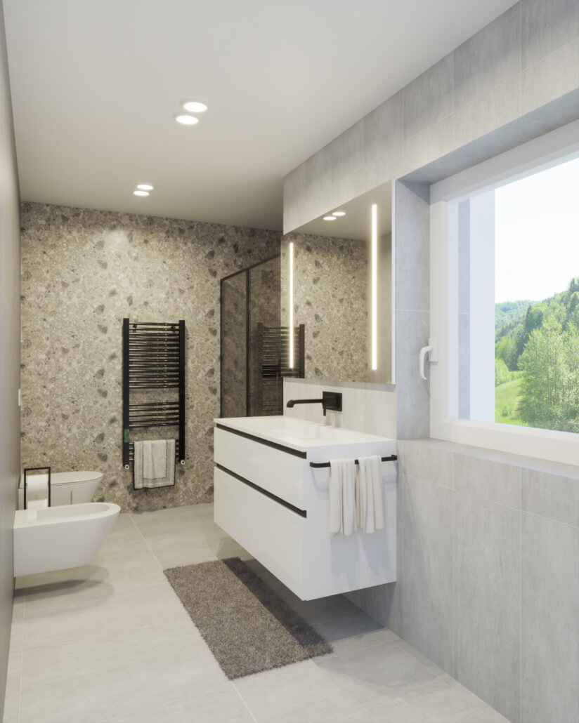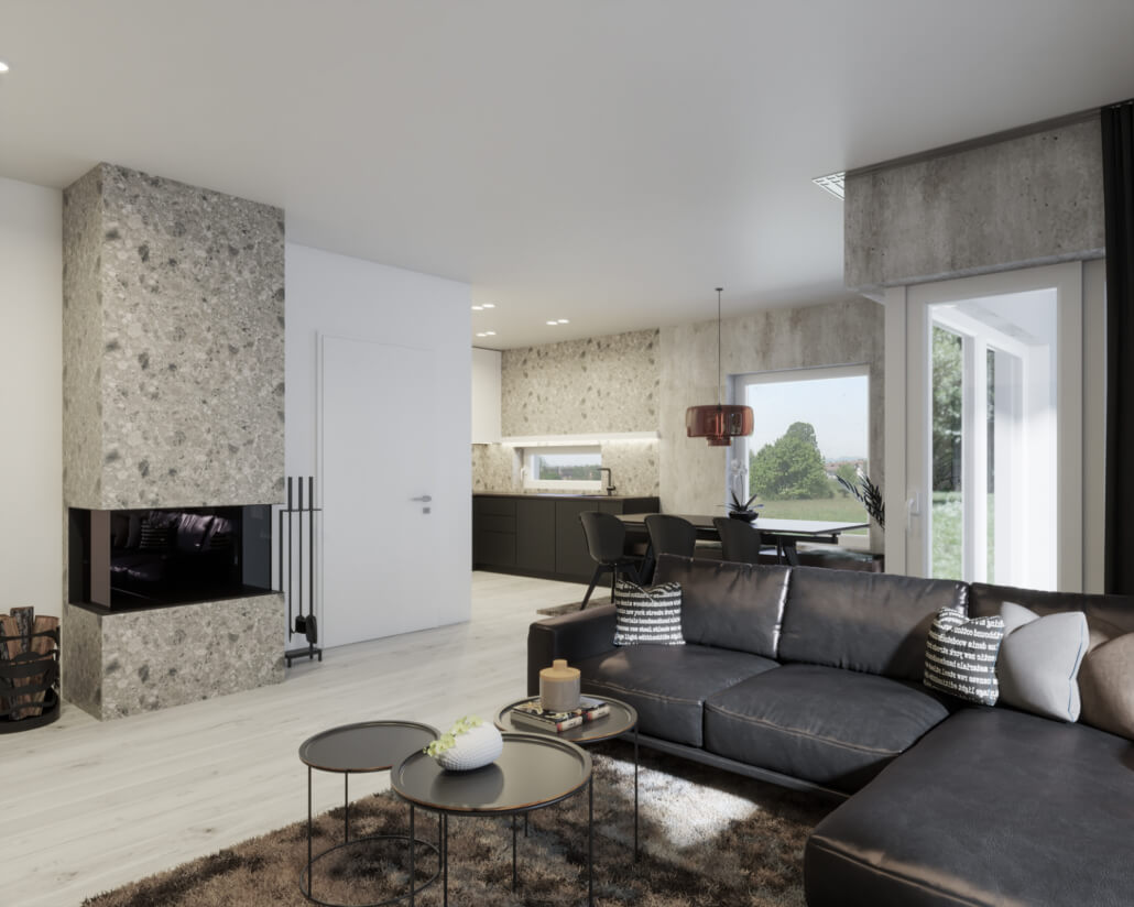 Zaradi odmaknjenosti od cestnih prometnic mir in tišina nista vprašljiva, premišljena troetažna razporeditev prostorov pa predvideva tako skupno preživljanje časa, namenjenega družini, kot samotno podajanje v delovne ali šolske obveznosti, pri čemer se vseskozi ohranja tesna vez z zunanjimi površinami v obliki lože, atrija in velikih oken, ki omogočajo nemoteno opazovanje okolice.
